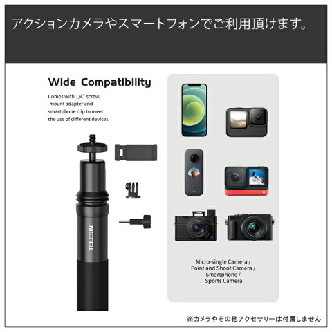 ・1/4インチネジと取り外し可能なアクションカメラマウントアダプターとスマートフォンホルダーを付属した自撮り棒です。