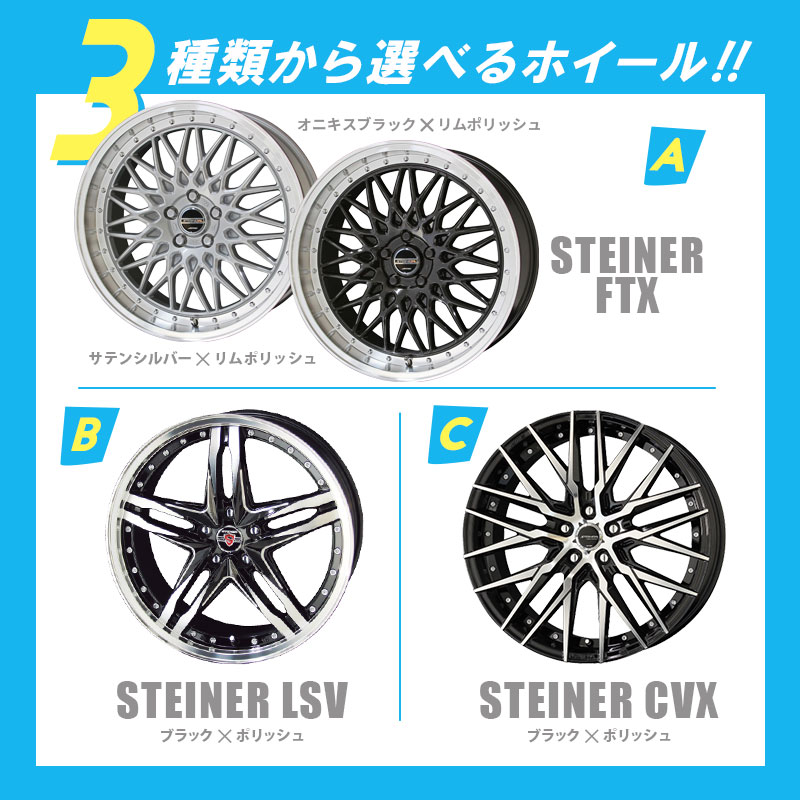 ●タイヤ タイヤ種類:TOYOTIRE PROXES CL1 SUV(トーヨータイヤ プロクセス・シーエルワン エスユーブイ) タイヤサイズ:225/60R18 104V ●ホイール ホイール:AME シュタイナー 3種類 [A-1]STEINER FTX カラー:オニキスブラック×リムポリッシュ [A-2]STEINER FTX カラー:サテンシルバー×リムポリッシュ [A]サイズ サイズ:18インチ リム幅:7.5J インセット:48 H-P.C.D:5-114.3 [B]STEINER LSV カラー:ブラック×ポリッシュ [B]サイズ サイズ:18インチ リム幅:8.0J インセット:47 H-P.C.D:5-114.3 [C]STEINER CVX カラー:ブラック×ポリッシュ [C]サイズ サイズ:18インチ リム幅:8.0J インセット:48 H-P.C.D:5-114.3 上記[A]〜[C]からお選びいただけます。