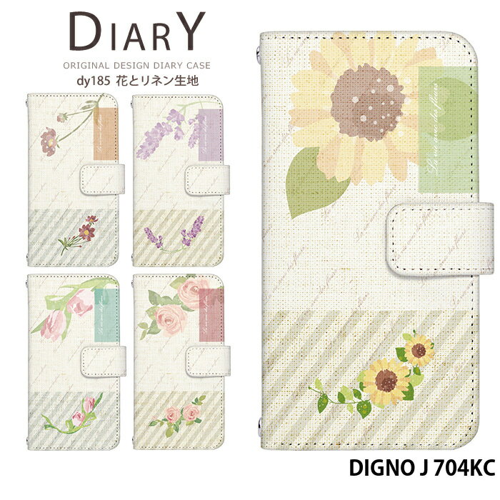 DIGNO J 704KC ケース 手帳型 ディグノ カバー スマホケース デザイン ベルトなし 花とリネン生地 ナチュラル シンプル 北欧 花柄 かわいい ストラップホルダー