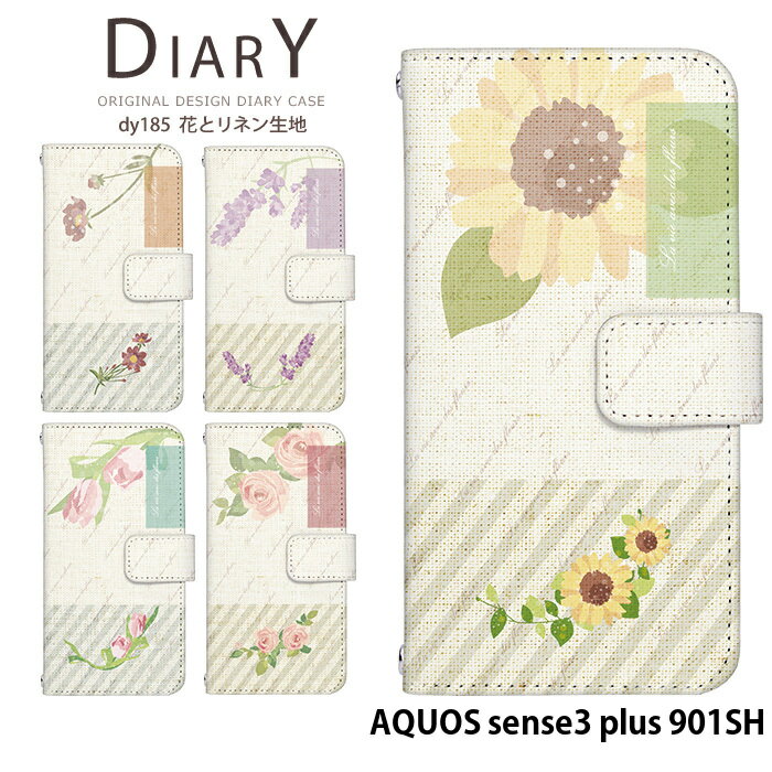 AQUOS sense3 plus 901SH ケース 手帳型 アクオスセンス3 プラス カバー スマホケース デザイン ベルトなし 花とリネン生地 ナチュラル シンプル 北欧 花柄 かわいい ストラップホルダー