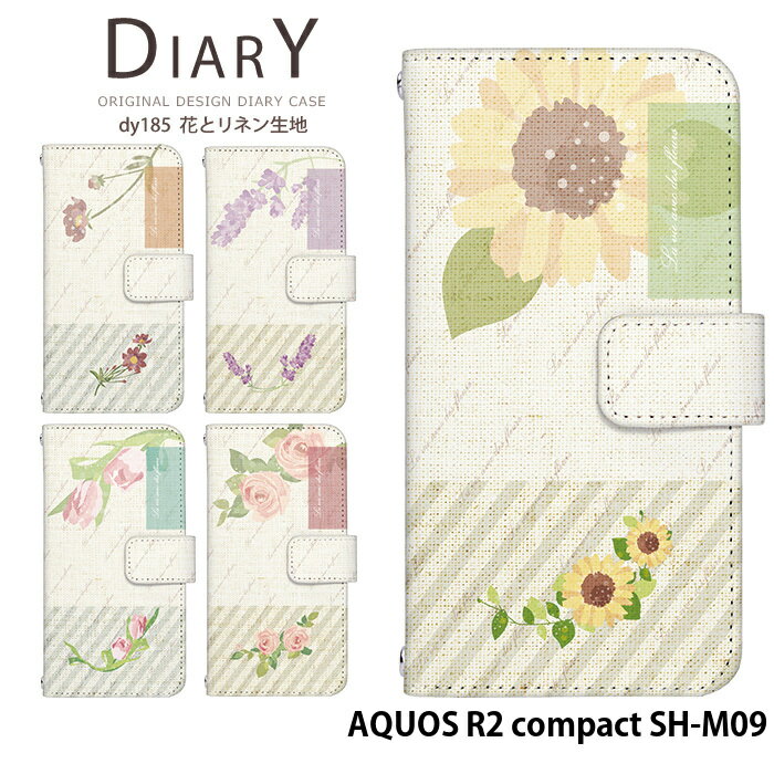 AQUOS R2 compact SH-M09 ケース 手帳型 アクオス r2 コンパクト カバー スマホケース デザイン ベルトなし 花とリネン生地 ナチュラル シンプル 北欧 花柄 かわいい ストラップホルダー