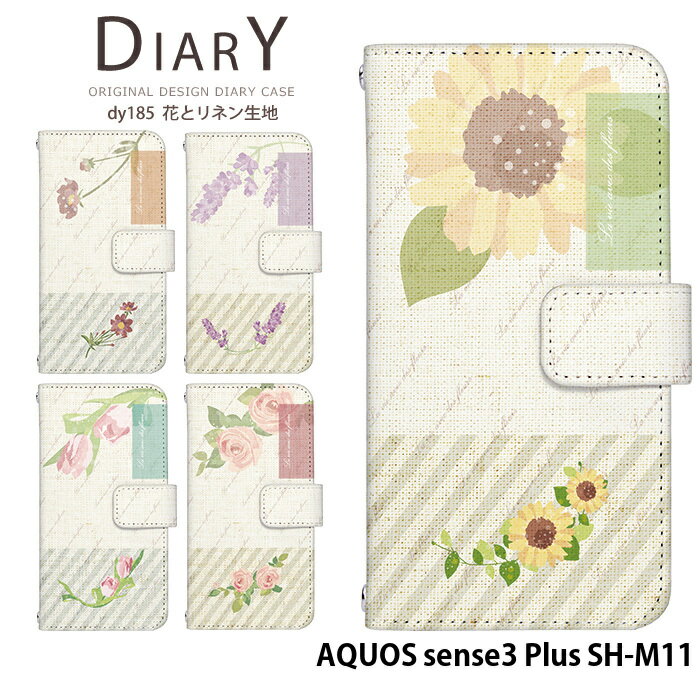 AQUOS sense3 Plus SH-M11 ケース 手帳型 アクオスセンス3 プラス カバー スマホケース デザイン ベルトなし 花とリネン生地 ナチュラル シンプル 北欧 花柄 かわいい ストラップホルダー