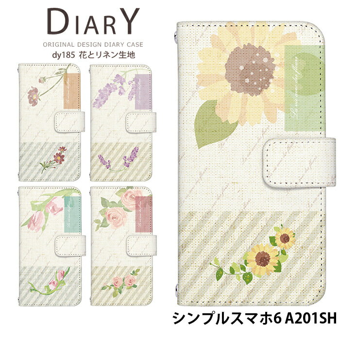 シンプルスマホ6 A201SH ケース 手帳型 カバー スマホケース デザイン ベルトなし 花とリネン生地 ナチュラル シンプル 北欧 花柄 かわいい ストラップホルダー