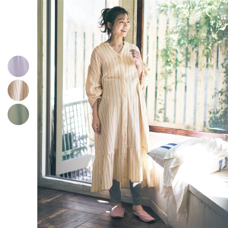 ラベンダー系ストライプアイボリー系ストライプスモーキーグリーン綿100%でサラッとした着心地のいいパジャマは、ドロップショルダーのボリューム感のある袖や裾のティアードシルエットがかわいさ満点。