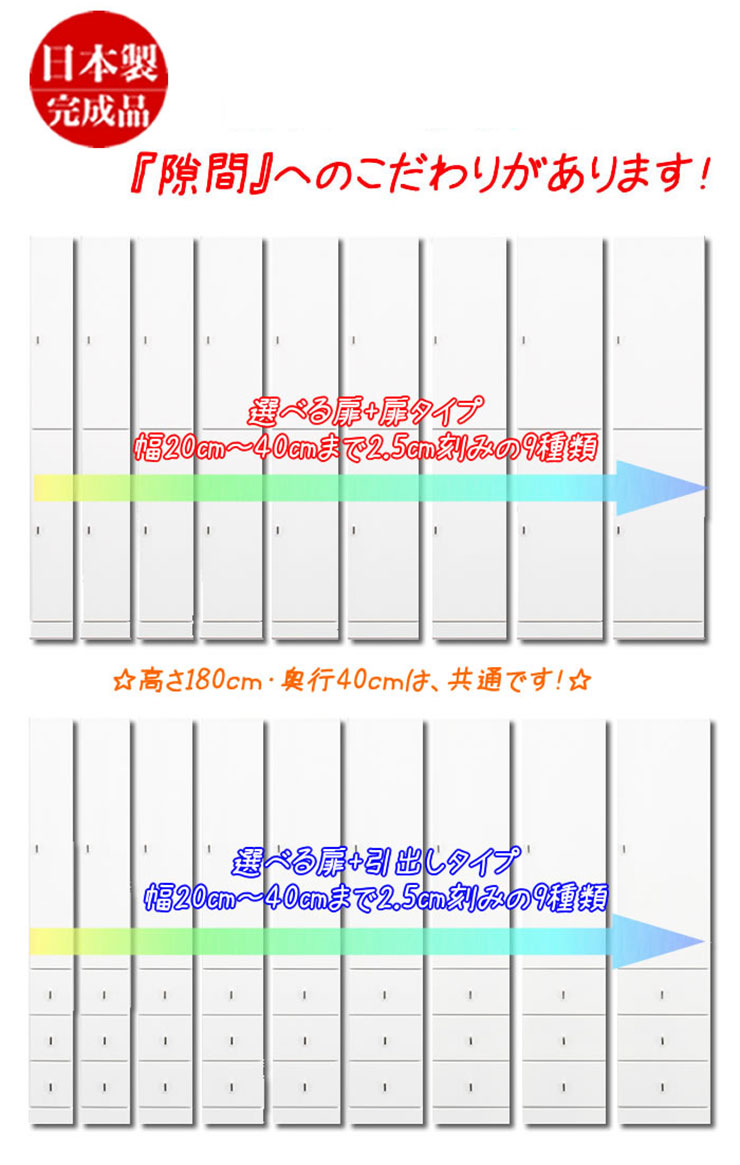 2.5cm単位で幅を選べる 隙間収納 扉/扉タイプ幅20cm幅22.5cm幅25cm幅27.5cm幅30cm幅32.5cm幅35cm幅37.5cm幅40cm2.5cm単位で幅を選べる 隙間収納 扉/引き出しタイプ幅20cm幅22.5cm幅25cm幅27.5cm幅30cm幅32.5cm幅35cm幅37.5cm幅40cm