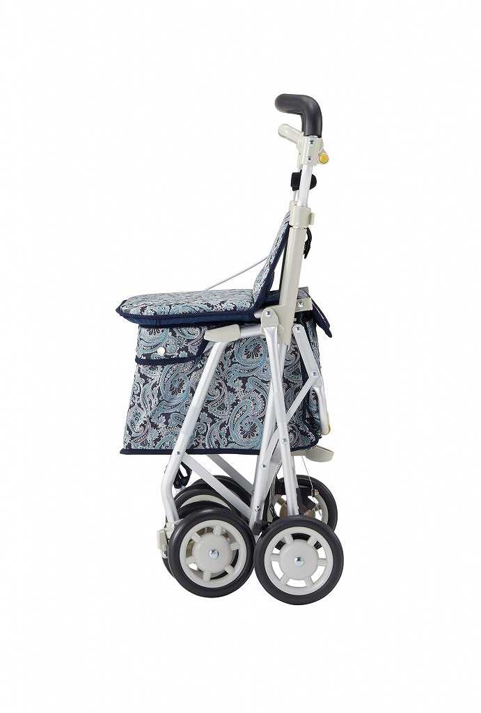 サイズ/幅45×奥行55×高さ88〜97(4段階/3cm)cm、折りたたみ時:奥行31×高さ80.5cm、座面:幅33×奥行26cm、座面高:45cm 車輪サイズ/前輪14.5×後輪14.5cm 重さ/4.2kg 材質/フレーム:アルミ・一部プラスチック、バッグ:ナイロン 最大使用者体重/100kg バッグ容量/16.6L 積載荷重/12kg 標準機能/折りたたみ、3WAYキャスター(360°・左右40°・固定)、手元ブレーキ、駐車ブレーキ、座面、杖・傘立て 生産国/台湾 SGマーク取得商品