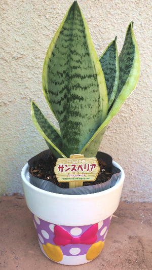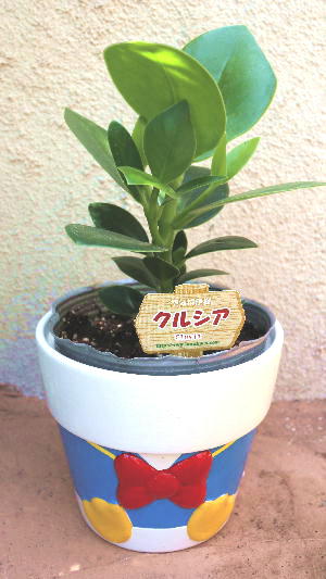 ドナルドダックとデイジーの鉢カバーに、植物は、クルシアとサンセベリアをセット。
