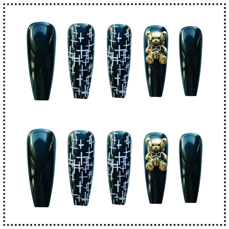 おすすめ!【24枚入り】ネイルチップ ツールキット付き 付け爪 つけ爪 貼るネイル ネイルシール チップ つや消し 爪チップ ブライダル ウエディング 結婚式 成人式 接着剤 研磨紙 披露宴 レーディス ブラック クロス柄 十字柄 十文字柄 3D 熊 141