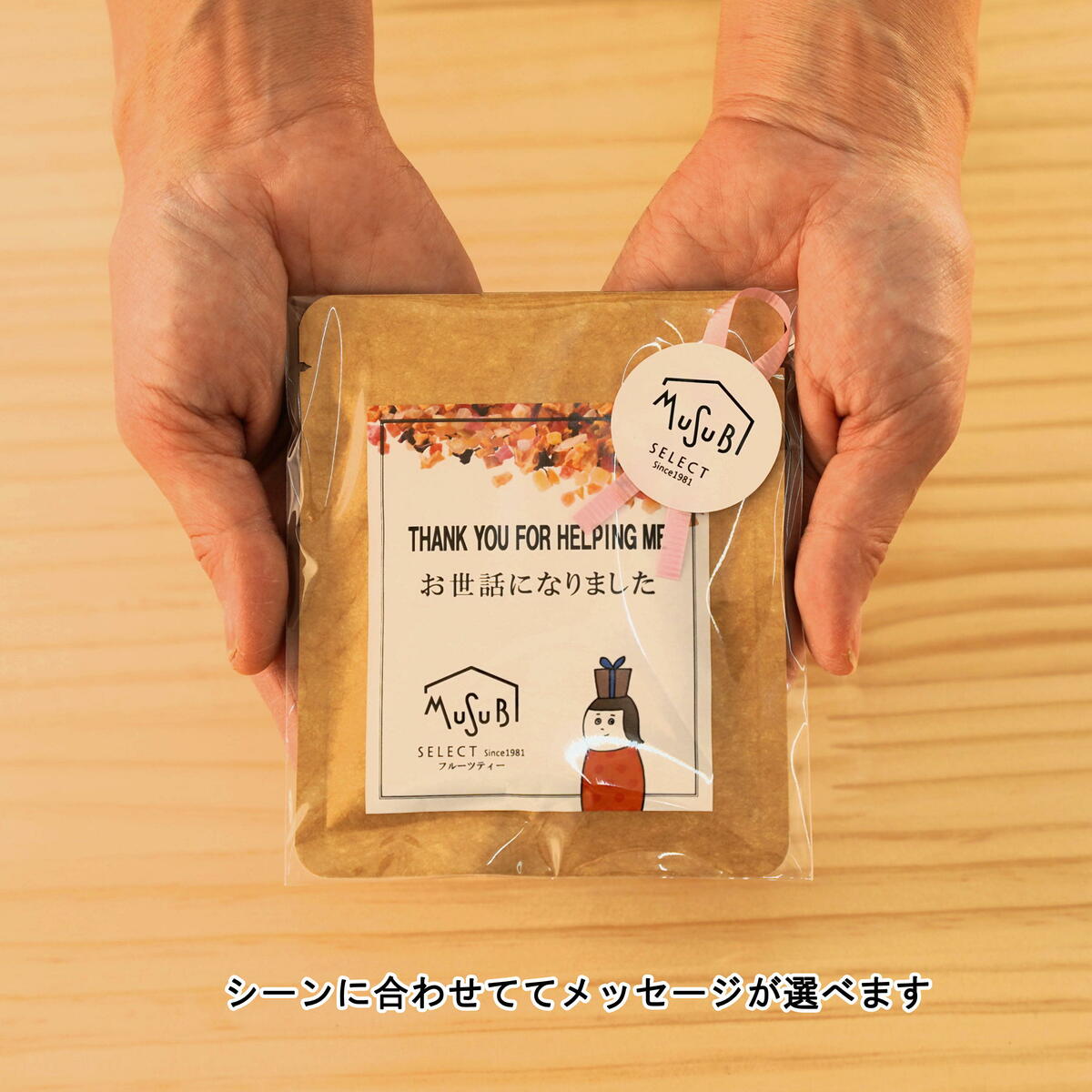 プチギフト メッセージが選べる ドライフルーツティー Fleuri フルーリ 10g×1p【ティートリコ ティート 】【 お世話になりました ほんの気持です いつもありがとう】職場 退職 転勤 産休 ばらまき お返し ギフト 食べれるフルーツティー 透明の袋に入っていてリボンシール付 ムスビセレクトフルーツティギフト はご挨拶、ちょっとしたプレゼントに最適です 女子会プレゼント用 ムスビコーヒーの人気のオリジナルキャラクターの『マグ君』と『ケトル君』です。