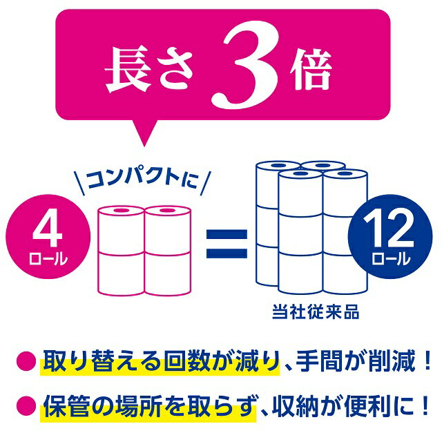 4ロールで12ロール分の長さのプリントトイレットロール たっぷり使えて取替えの手間を軽減、省スペース化で保管もスッキリ。