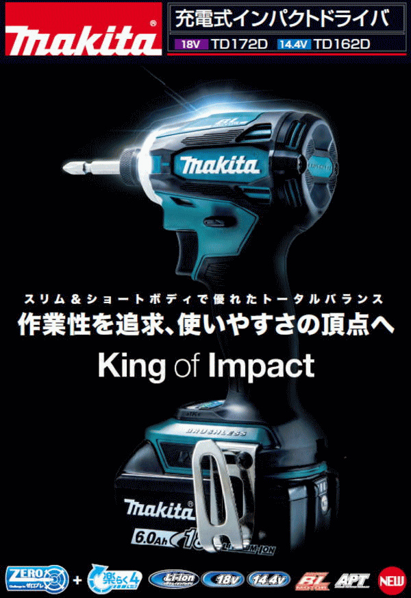 充電式インパクトドライバ TD172DRGX 標準小売価格68100円(税別) バッテリBL1860B×2本・充電器DC18RF・ケース付 スリムボディで業界最小の傾き約10.5度(ビット長さ65mm、壁際10mmでの作業時、締付トルク160N・m以上のインパクトドライバにおいて) 優れた隅打ち性能でカムアウトを低減。