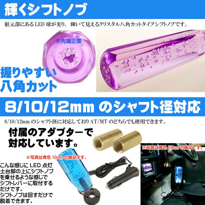 商品名 光るクリスタルシフトノブ八角 シャフト径8/10/12mm対応 商品説明 根元部にあるLED球が光り、輝いて見えるクリスタル八角カットタイプシフトノブです。