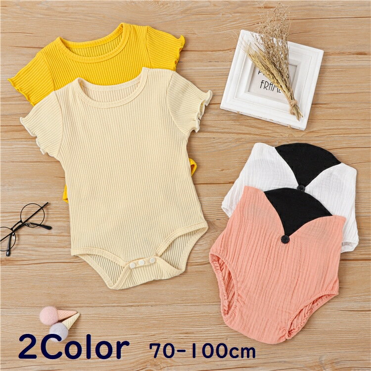 送料無料 セットアップ ベビー キッズ 子供用 赤ちゃん ロンパース 半袖 ショートパンツ ハイウエスト 2点セット 上下セット 無地 リブ メロウフリル クルーネック かわいい おしゃれ 子供服
