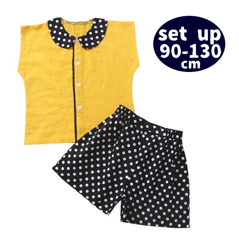 送料無料 セットアップ キッズ 子供服 上下セット 薄手 シャツ 丸襟 ノースリーブ 前開き ボタン ショートパンツ 短パン ドット柄 かわいい