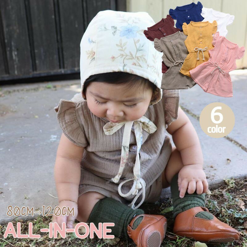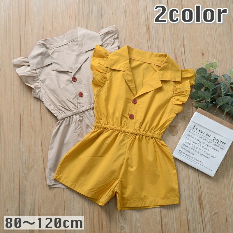 送料無料 オールインワン キッズ ベビー 子供用 女の子 ノースリーブ フリル 前ボタン 襟付き ウエストゴム ショートパンツ 無地 シンプル お洒落 普段使い お出かけ 女児 子供服