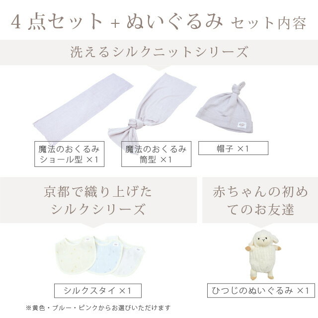 商品情報 ■セット内容 ・おくるみショールタイプ1点 ・おくるみ筒形タイプ1点 ・スタイ1点 ・シルクニット帽子1点 ・ぬいぐるみ ●京都の丹後で織り上げたシルクのスタイ オリジナルシルク生地で作られたスタイです。