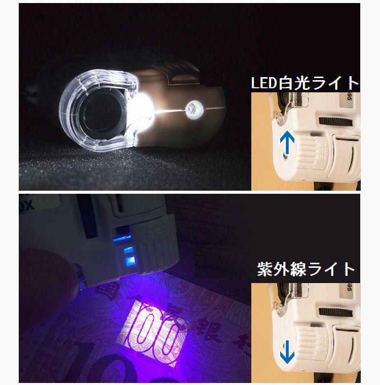 LED白光ライトと、蛍光物質などに反応するUV(紫外線)ライトを選択可能。