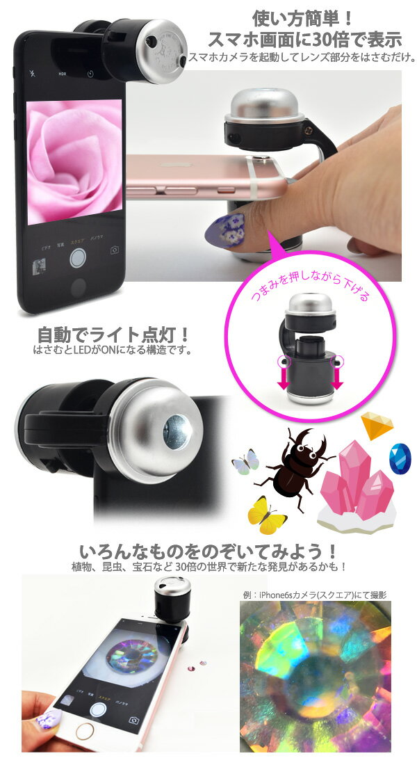 スマホカメラ用LEDライト搭載マイクロスコープ(30倍)ミニ顕微鏡(スマホカメラ用 スコープ 観察 夏休み 自由研究 宿題 研究 発見 レンズ ピント 昆虫観察 )