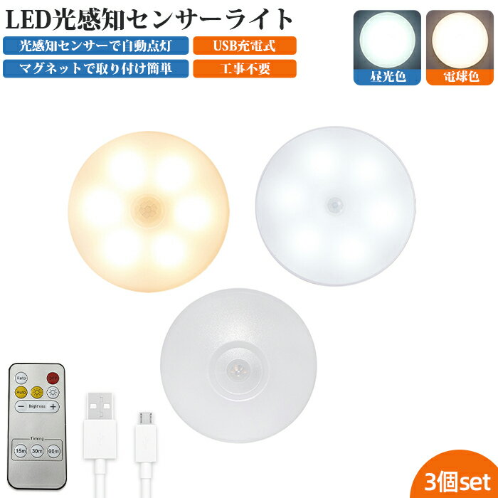 センサーライト フットライト 人感センサーライト 3個セット リモコン付 LED 屋内 室内 USB リチウム電池 足元ライト ナイトライト ライト 充電 階段 玄関 廊下 トイレ クローゼット 物置 工事不要 配線不要 自動点灯 消灯 光センサー マグネット 点灯モード付 送料無料