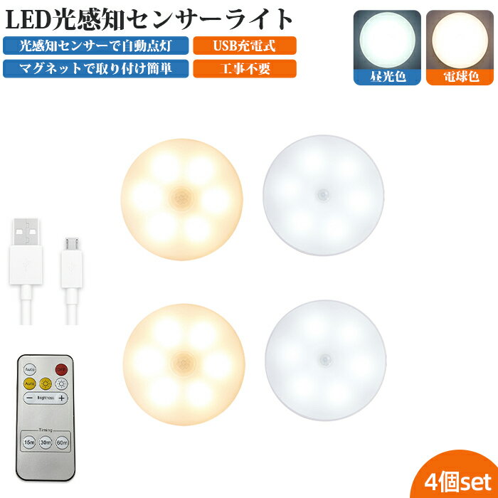 センサーライト フットライト 人感センサーライト 4個セット リモコン付 LED 屋内 室内 USB リチウム電池 足元ライト ナイトライト ライト 充電 階段 玄関 廊下 トイレ クローゼット 物置 工事不要 配線不要 自動点灯 消灯 光センサー マグネット 点灯モード付 送料無料