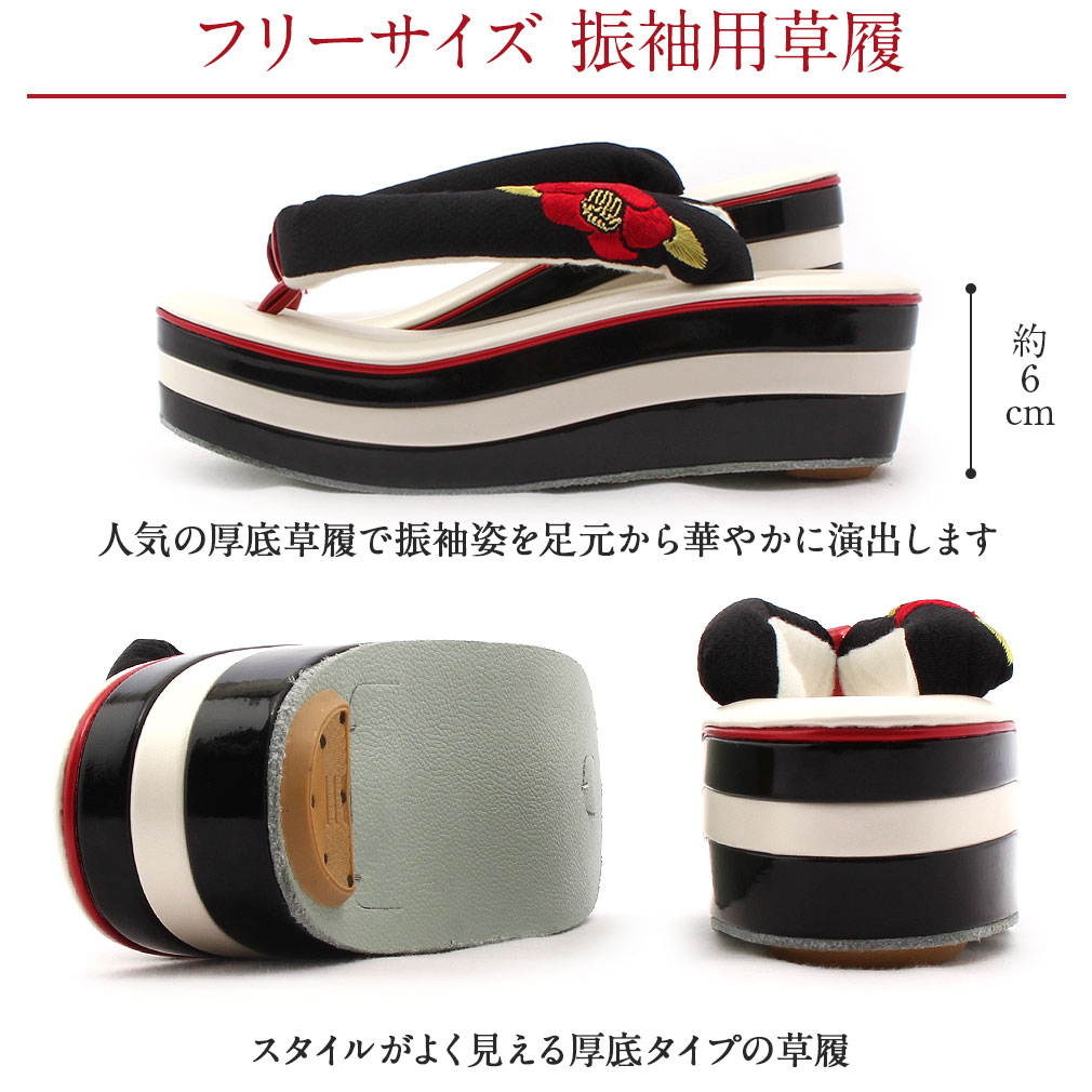 商品情報 椿の刺繍花緒が古典的で華やかな振袖用草履です。
