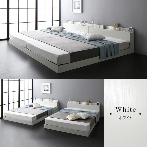■サイズ・色違い・関連商品 セミシングル(80cm/SS)シングル(97cm/S) フレームのみ ポケットコイルマットレス付き ボンネルコイルマットレス付きフレームのみ ポケットマットレス付き ボンネルマットレス付き セミダブル(120cm/SD) ダブル(140cm/D) フレームのみ ポケットコイルマットレス付き ボンネルコイルマットレス付き フレームのみ ポケットコイルマットレス付き ボンネルコイルマットレス付き クイーン(160cm/SS+SS) キング(180cm/SS+S) フレームのみ ポケットコイルマットレス付き ボンネルコイルマットレス付き フレームのみ ポケットコイルマットレス付き ボンネルコイルマットレス付き Wキング(200cm/S+S) Wキング(220cm/S+SD) フレームのみ ポケットコイルマットレス付き ボンネルコイルマットレス付き フレームのみ ポケットコイルマットレス付き ボンネルコイルマットレス付き Wキング(240cm/S+D) Wキング(240cm/SD+SD) フレームのみ ポケットコイルマットレス付き ボンネルコイルマットレス付き フレームのみ ポケットコイルマットレス付き ボンネルコイルマットレス付き Wキング(260cm/SD+D) Wキング(280cm/D+D) フレームのみ ポケットコイルマットレス付き ボンネルコイルマットレス付き フレームのみ ポケットコイルマットレス付き ボンネルコイルマットレス付き■商品内容【みんなでゆったり眠れるローベッド】1:最大約280cmのベッドでみんなで眠る2:ライフサイクルにあわせて変化可能3:便利な照明・2口コンセント付き■家族一緒にゆったり眠れる連結ベッド 連結・分割が自由にできるから、家族の成長に合わせて長く使える ・子どもが大きくなったら分割して使える ・コの字金具で簡単しっかり連結■みんなが安心できる優しいデザイン 高さが低めなので、お子様にも安心のベッド ・安心の高さ ・足を挟まない ・シーツ換えも簡単■照明&コンセント付きヘッドボード 枕元に必要なものを全部置ける便利な棚付き ・物が落ちにくいデザイン ・充電に便利な2口コンセント付き■超頑丈構造&抜群の通気性 桟の数を多くし歪みにくく、安定感のあるつくり ・金具プレートでしっかり固定 ・LVLすのこで強度抜群 ・敷布団でも使える仕様 ※耐荷重/SS、S:120kg、SD、D:200kg■COLOR WHITE ホワイト:薄桜のような温かみのある「ホワイト」は圧迫感を抑えながらお部屋を明るく見せます。