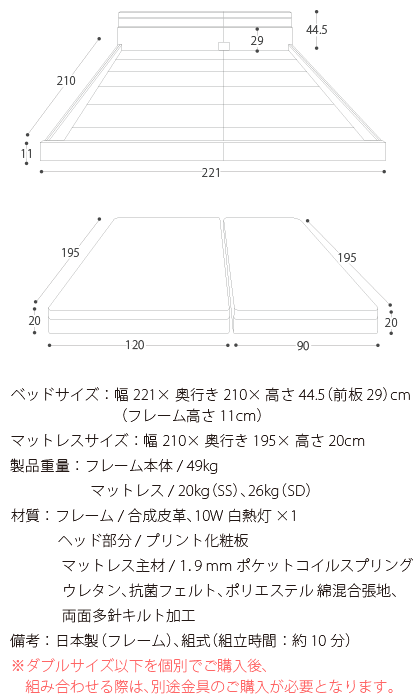 ベッドサイズ:幅221×奥行き210×高さ44.5(前板29)cm(フレーム高さ11cm) マットレスサイズ:幅210×奥行き195×高さ20cm 製品重量:フレーム本体 / 49kg、マットレス / 20kg(SS)、26kg(SD) 材質: フレーム / 合成皮革、10W白熱灯×1、ヘッド部分 / プリント化粧板、マットレス主材 / 1.9mmポケットコイルスプリング、ウレタン、抗菌フェルト、ポリエステル綿混合張地、両面多針キルト加工 備考:日本製(フレーム)、組み立て式(組立時間:約10分) ※ダブルサイズ以下を個別でご購入後、組み合わせる際は、別途金具のご購入が必要となります。