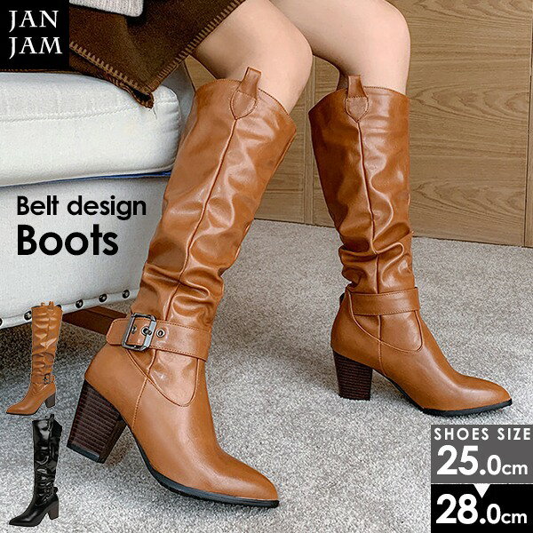 大きいサイズ レディース ロングブーツ【25〜28cm】くしゅくしゅ ベルト ポインテッドトゥ ハイヒール