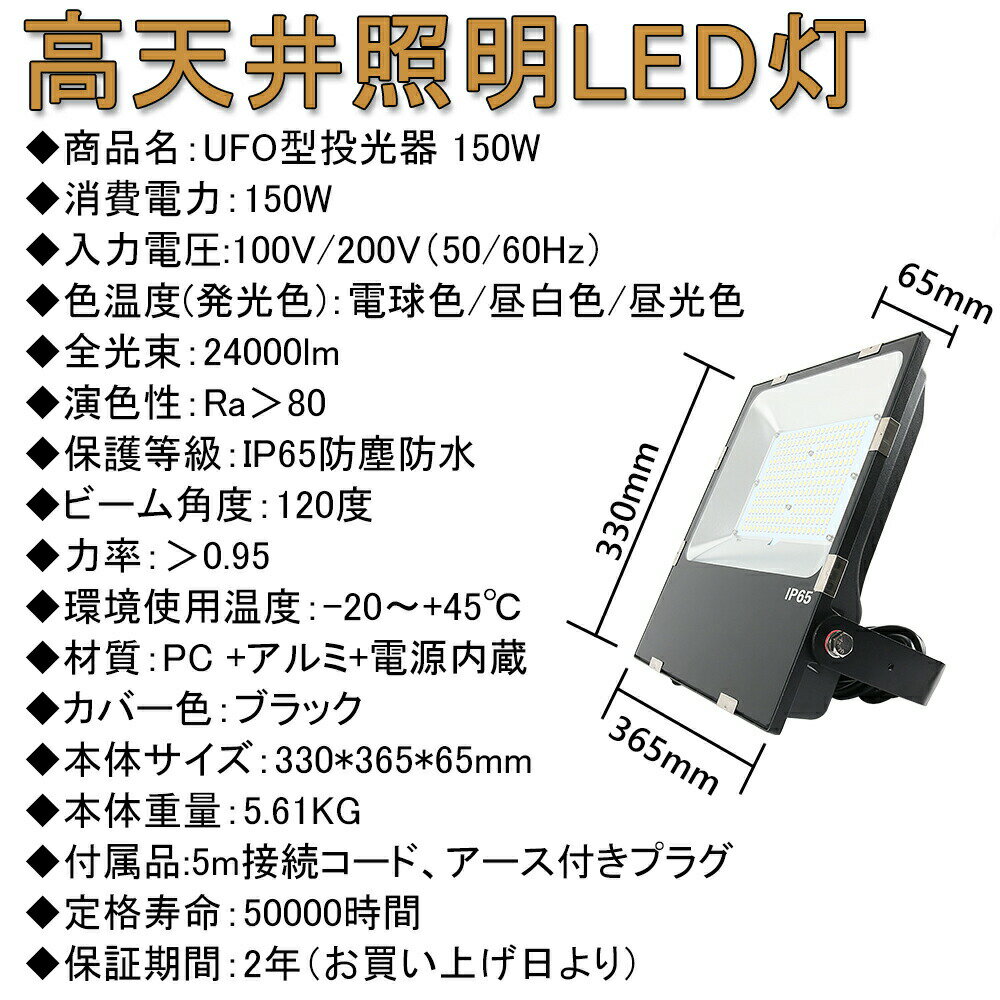 LED投光器50W LED投光器80W LED投光器100W LED投光器150W LED投光器200W UFO盤型LED投光器100W UFO盤型LED投光器150W UFO盤型LED投光器200W UFO盤型LED投光器300W 製品仕様 商品状態: 新品&未使用 品番: LED投光器150W 消費電力: 150w 全光束: 24000lm 色温度: 昼光色/昼白色/白色/電球色選択可能 重量: 5.61KG サイズ: 330*365*65MM IP保護等級: 防水IP65 照射角度: 120° 角度調整可能: 最大180° 演色評価数: 80Ra以上 動作保障温度: ‐20〜45℃ 入力電圧: AC85-265V(100-200V兼用) 50/60Hz 電源内蔵: 電源メーカ 日本製MeanWell 材質: 防錆性鋳造アルミ + 強化ガラス 付属品: 5m接続コード、ACプラグ 定格寿命: 50000時間 保証: 2年間 #検索キーワード# LED投光器200W led 投光器 100v LED投光器 LED投光器200W led投光器 50w 屋外 投光器 200W LED投光器 200w 100w 投光器 led 屋外 防水 200V LED投光器 屋外用 LED 300W 投光器 屋外 LED投光器200W LED照明器具 屋外用 工場 LED照明器具 工場室内灯 LED投光器 水銀灯交換用 150W 24000lm IP65防水 150W LED投光器 スタンド 屋外照明 広角 防水 ナイター照明 駐車場 看板灯 工事現場 昼光色6000K※【省エネ】業界最高な発光効率160lm/w、電気代約80%カット。