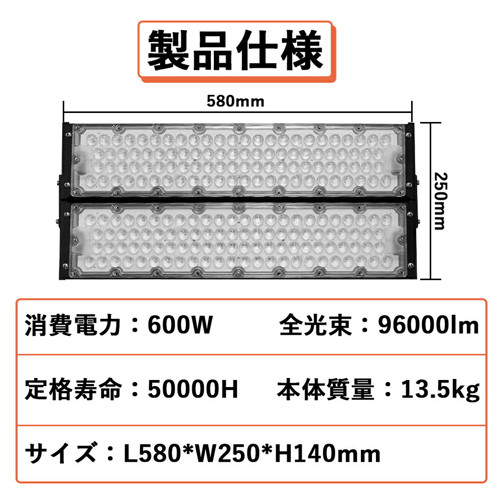 高輝度投光器 1個 ワット数300W600W900W1200W ▼まとめ買いがお得です▼ 2個セット〇〇〇〇 4個セット〇〇〇〇 10個セット〇〇〇〇 20個セット〇〇〇〇 【製品仕様】 商品名:高輝度投光器消費電力:600W全光束: 96000lm定格寿命:50000H本体材質:アルミニウム、PCカバー、強化ガラス電源:MEANWELL電源本体内蔵付属品:5m接続コード、アース付きプラグ照射角度:>120°環境使用温度:-20~+45℃本体サイズ: 580×250×140mm本体重量:13.5kg保証期間:2年 【2年保証】 安心してお使いいただけるように、お買い上げ日から2年間で、通常使用による故障が発生した場合は無料で修理また交換をさせていただきます。