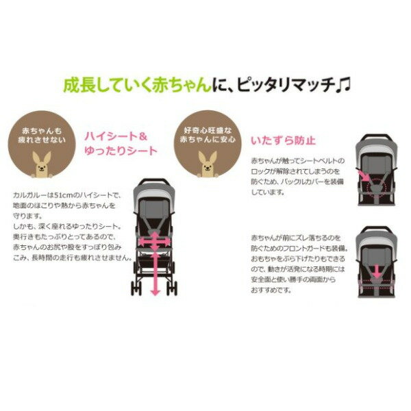 おでかけしたくなる軽さ 新生児から使えるA型ベビーカー【karugaroo first】 対象月齢/1カ月頃?36カ月頃 体重目安/15kgまで サイズ/ 44.5×84×106H(cm) 折りたたみ時:44.5×36×103H(cm) 製品重量/3.7kg 材質/アルミ、ポリエステル、ポリプロピレン、他 座面幅/32.5(cm) シート高さ/51(cm) バスケット容量/18L(耐荷重/5kg) SG基準適合(製品安全協会A型SG合格品)●お支払い方法で代引きはできません。