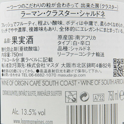 【年数表記にorがある商品は年数指定はできません】産地南アフリカ > ステレンボッシュ生産者ラーマン・ワインズ品種シャルドネ 100%英字Laarman Cluster Chardonnay内容量750mlJANコード6009900370804輸入元マスダラーマンはステレンボッシュに2016年設立の非常に若いワイナリー。