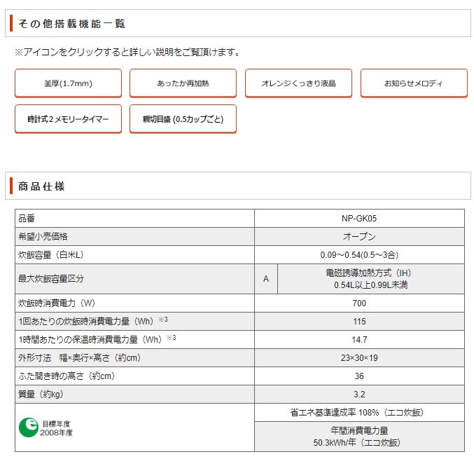 ◆AG+抗菌加工※2立つしゃもじ ※2 試験機関:一般財団法人ボーケン品質評価機構 試験方法:JIS Z 2801に基づく 抗菌の方法:AG+ 抗菌の対象部分:しゃもじ 試験結果:99%の抗菌効果(試験番号20220018093-1) ◆内釜:黒まる厚釜 厚さ1.7mm 商品仕様 カラー:ステンレスブラウン 容量:0.54L(3合炊き) 内釜:黒まる厚釜(厚さ1.7mm) 本体サイズ(約):幅23.0×奥行30.0×高さ19.0cm(ふた開き時の高さ:36.0cm) 重量(約):3.2kg 消費電力:700W メニュー: 白米、エコ炊飯、白米熟成、白米急速、炊きこみ、おかゆ、おこわ(取説対応) 雑穀米、玄米、麦ごはん(ふつう)、発芽玄米(取説対応)、無洗米、パン(発酵・焼き) 操作部:オレンジくっきり液晶 省エネ基準達成率(目標年度2008年度):108% 年間消費電力量:50.3kWh/年 年間目安電気料金:1360円