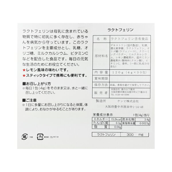 商品詳細 商品名 ラクトフェリン 内容量 120g(4g×30包)(約30日分) 原材料名 デキストリン(国内製造)、乳糖、還元麦芽糖、ラクトフェリン、オリゴ糖(ラフィノース)クリーミングパウダー、ミルクカルシウム、レモン濃縮果汁、温州ミカン濃縮果汁 / 酸味料(クエン酸)、ビタミンC、香料、(一部に乳成分を含む) 栄養成分表示1包(4g)当り エネルギー 15.2kcal、たんぱく質 0.3g、脂質 0.04g、炭水化物 3.4g、食塩相当量 0.0023g ラクトフェリン 300mg 販売者 有限会社 薬の山下薬局 お召し上がり方 毎日1包(4g)をそのまま又は、水と一緒に召し上ってください。