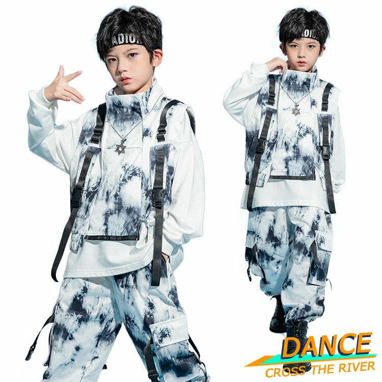 キッズ ダンス衣装 セットアップ 柄 ベスト パンツ 黒 白 ヒップホップ 子供 演出服 ロング丈パンツ 女の子 男の子 長袖 半袖 韓国 社交ダンス カッコイイ 長ズボン 練習服 ゆったり HIPHOP 応援団 団体注文可 発表会 ステージ衣装 110-180cm