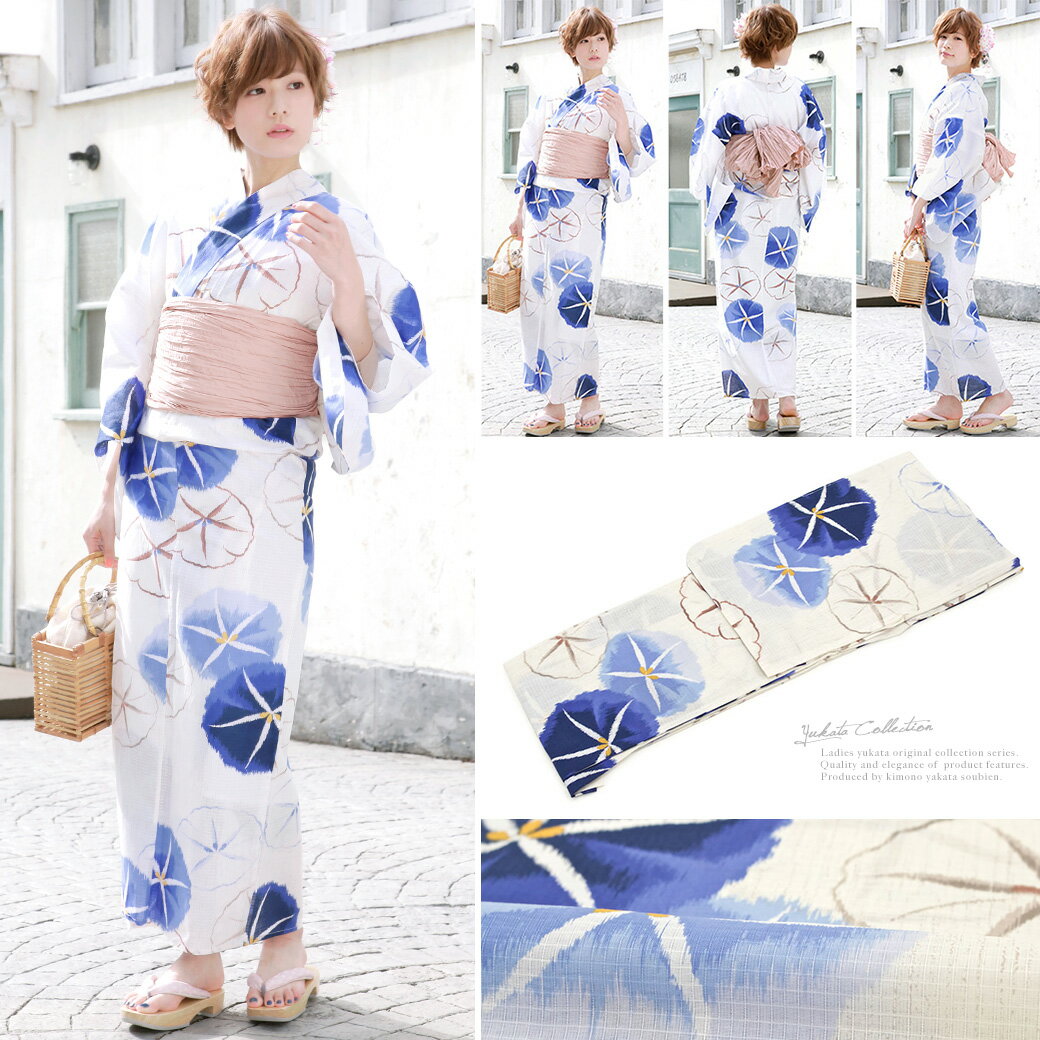 浴衣 セット レディース レトロ 浴衣セット 大人 3点セット 白系 ホワイト 紺 ピンク系 朝顔 あさがお アサガオ 綿 紅梅 ラメ 兵児帯 女性 ボヌールセゾン フリー 【あす楽対応】