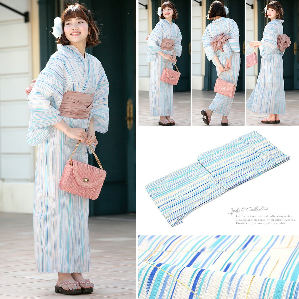 浴衣 セット レディース レトロ 浴衣セット 大人 3点セット 水色 ブルー 青 白 ピンク 縞 ストライプ ラメ 綿 紅梅織 兵児帯 女性 ボヌールセゾン フリー 【送料無料】【あす楽対応】【浴衣 セット】
