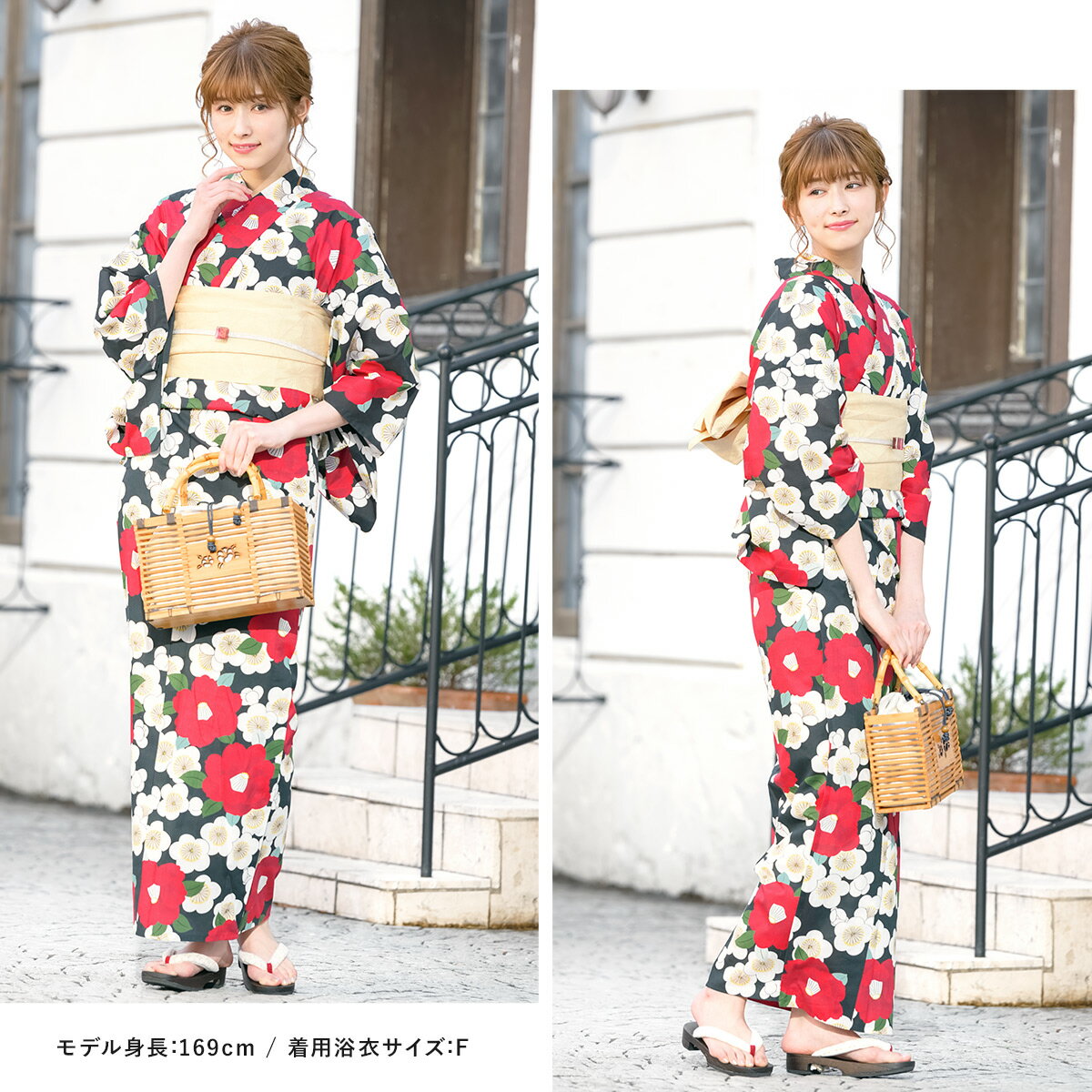 浴衣 セット レディース レトロ 浴衣セット 大人 3点セット ブラック 黒 レッド 赤 ホワイト 白 椿 ツバキ 梅 うめ 花 フラワー 綿 夏祭り 花火大会 女性用 S・フリー【送料無料】【浴衣 セット】【あす楽対応】